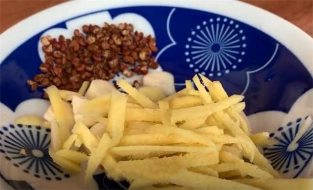 6.下面準(zhǔn)備點(diǎn)配料,一塊生姜,一小把花椒,一把小米辣,一把大蒜,150g生抽,30g白糖,100g香醋,把生姜切片,再切成絲,大蒜切片,小米辣切成斜段,全部切好放進(jìn)碗里面。