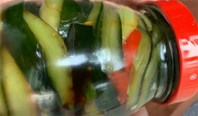10.然后準(zhǔn)備一個(gè)無(wú)水無(wú)油的瓶子,把黃瓜放進(jìn)去,這樣密封放冰箱冷藏保存,放一個(gè)月都不會(huì)壞,隨吃隨拿。