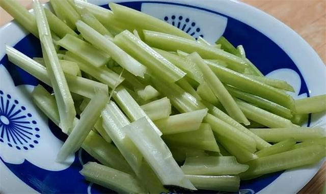 4.準(zhǔn)備一把芹菜把葉子摘掉,葉子不要扔可以留著烙餅吃,全部摘好清洗干凈控干水分,再把芹菜斜刀切成5厘米左右的段,切好放入碗中備用。