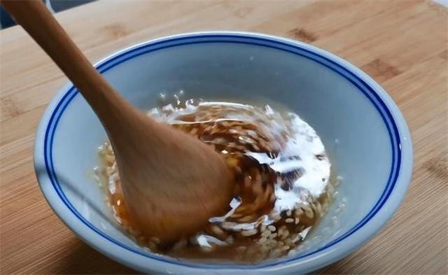 6.再準(zhǔn)備四瓣大蒜切成蒜末,放入碗中,碗中加入兩勺白芝麻,鍋中燒點(diǎn)熱油,油熱之后澆在蒜末上面,再往里面加入兩勺生抽,兩勺香醋,一勺辣椒油,用勺子攪拌均勻,放一邊備用。