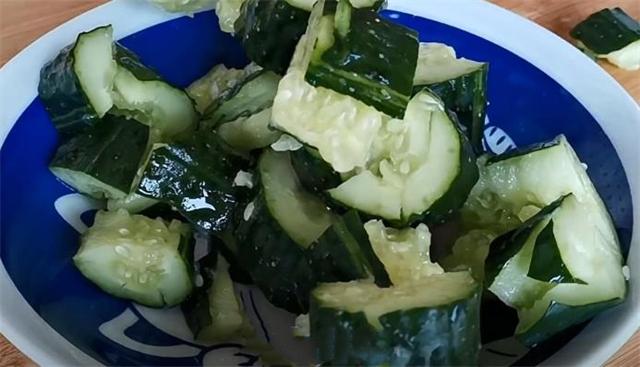 1.準備一根黃瓜洗凈,再用刀把它拍碎,然后切成小塊,切好放入碗中備用。