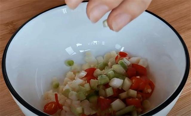 4.準備四瓣大蒜切成蒜末,準備四根小米辣將它切成小圈,準備適量蔥白切成末。