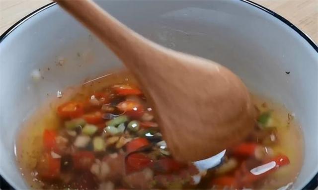6.鍋中燒點熱油,油熱之后澆在蒜末上面,碗中再加入兩勺生抽,兩勺香醋,兩勺香油,一勺食鹽,一勺白糖提鮮,用勺子將它們攪拌均勻。