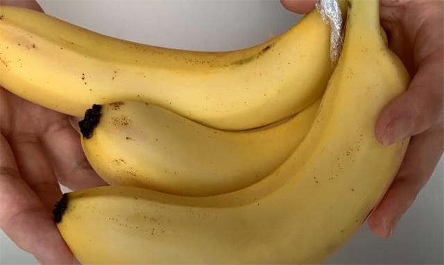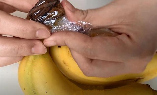 5.然后用廚房紙把香蕉表面的水分擦干,香蕉的根部會散發出乙烯氣體,就是因為這樣香蕉很容易爛掉,我們可以用保鮮膜把香蕉的根部包起來,將它包裹起來可以防止乙烯氣體的散發。