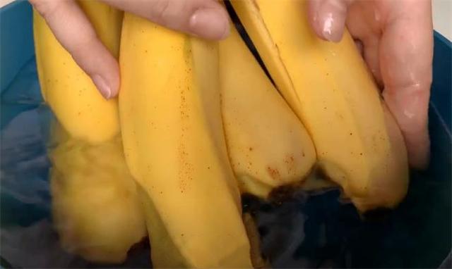 4.香蕉如果買多了容易爛,下面給大家介紹一下香蕉該如何保存,先準備一盆清水,加入一勺食鹽,把沒吃完的香蕉放進去清洗一下,這樣可以把香蕉表面的催熟劑洗掉,還可以殺菌。