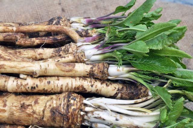辣根:辣根是一種多年生直立草本植物,屬于十字花科,又稱為馬蘿卜、山葵蘿卜。其根莖為肉質根,可食用部分為根莖和葉子。