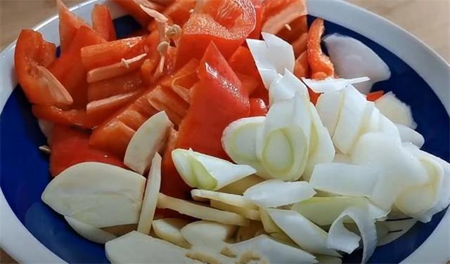 5.趁現在準備點配菜,準備一根紅椒,從中間切開,再切成小塊,切好放入碗中,準備4瓣大蒜切片,切好放入碗中,準備一根大蔥斜刀切片,放入碗中備用。