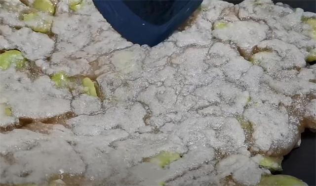 3.再加入少許食用油,用鏟子把表面按平整,繼續開小火煎,像這樣反復翻面,煎成這樣就可以了。