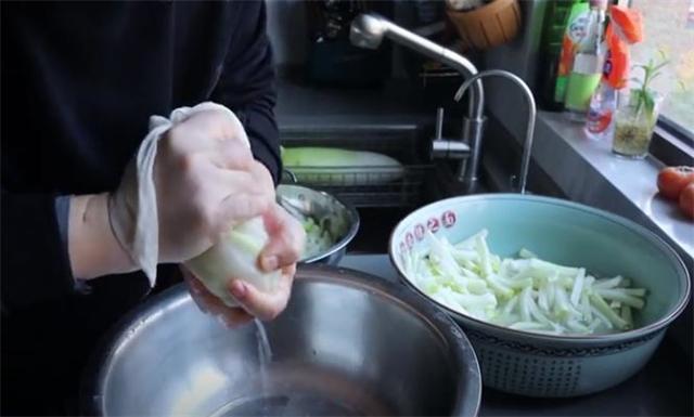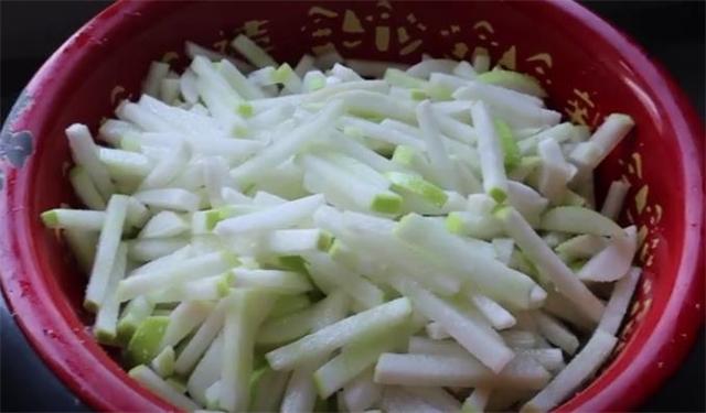 3.蘿卜腌兩個小時后,里面已經(jīng)腌出了不少的水分,然后用紗布將蘿卜包住,使勁擰干蘿卜里面的水分。