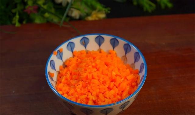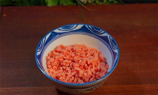 3.然后再準(zhǔn)備一根胡蘿卜,把胡蘿卜切成小丁備用。