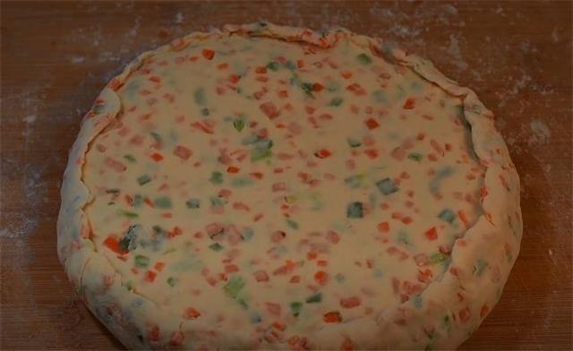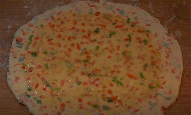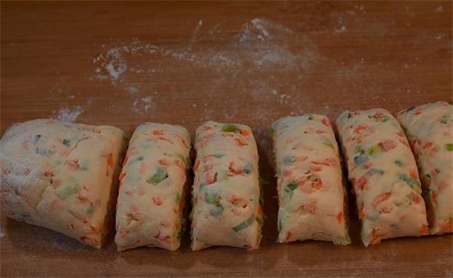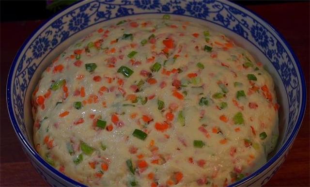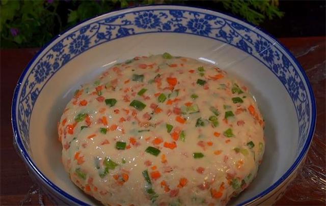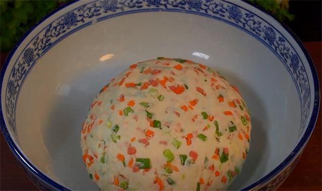 5.接下來往盆中加入500g普通面粉,然后再加入5g酵母粉,再加入少許的食鹽,增加面粉的筋性,也可以先入個(gè)底味,然后用筷子攪拌均勻,再放入切好的青椒丁,火腿丁和胡蘿卜丁,把切好的蔥花也放進(jìn)去,用筷子攪拌均勻,攪勻后分次少量的往里面加入溫水,邊加邊用筷子攪拌,攪拌成面絮狀后下手揉成面團(tuán),揉成表面稍微光滑一點(diǎn)的面團(tuán)就可以了。