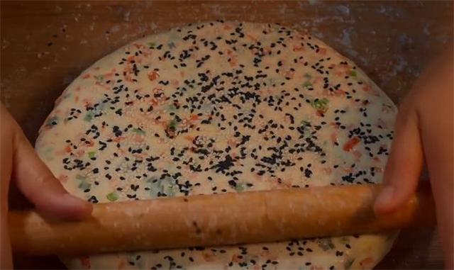 11.然后再翻個(gè)面,往上面刷上一層清水,再撒上一點(diǎn)黑白芝麻,用搟面杖輕輕壓一下,防止芝麻掉下來。