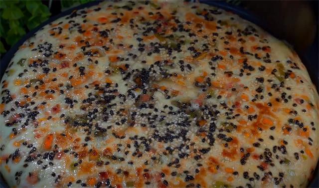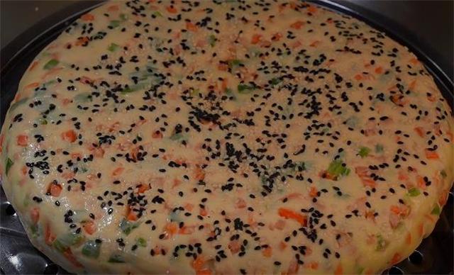 準(zhǔn)備食材: 小蔥、青椒、胡蘿卜、素火腿腸、普通面粉、酵母粉、鹽、溫水、食用油、十三香、清水、黑白芝麻 具體做法: