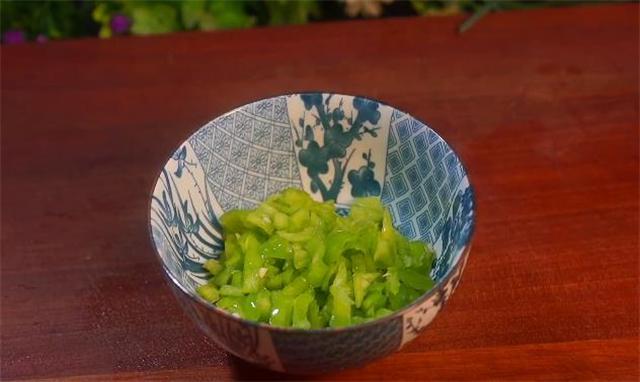2.再準(zhǔn)備一個(gè)青椒切成小丁,切好之后備用。