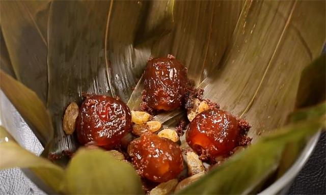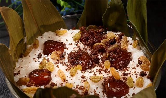 4.放上兩勺煮熟的糯米,用鏟子壓實鋪平,接著再放一點蜜棗和葡萄干,然后再放上一層煮熟的糯米,同樣壓實鋪平,最上面一層再放一點蜜棗和葡萄干,撒上一點紅糖,用粽葉包住。