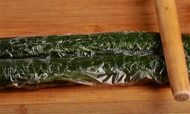 1.準備兩根黃瓜洗凈,再把黃瓜放保鮮袋里用搟面杖捶一捶,把黃瓜捶碎,這樣更容易入味。