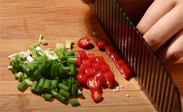 5.一把小蔥切成蔥花,再準備幾個小米辣切成圈,放碗里備用。