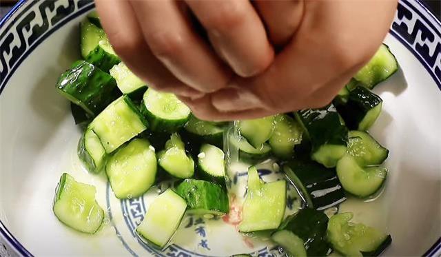8.時間到了,黃瓜已經腌出了很多的水分,然后用力擠出水分,盡量把水分擠干一點,這樣擠過水分的黃瓜,吃起來會更加的清脆爽口。
