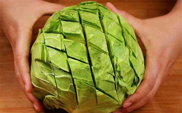 1.準備一顆包菜,先把包菜橫刀給它切過來,然后再交叉切成菱形小塊,切成這個樣子就行了。
