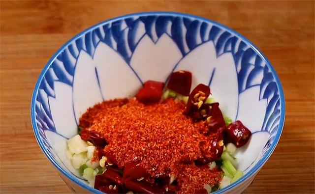 4.接著再準備一點小蔥切成蔥花,再切點蒜末,再準備幾個干辣椒切成小段,切好之后放入碗中,往里面加入一勺辣椒面。