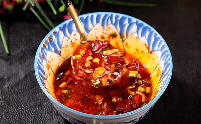 7.碗里面澆上熱油,激發出香味,用筷子攪拌均勻,加適量的食鹽和白糖,再加1勺生抽,再加入3勺陳醋,用勺子攪拌均勻。