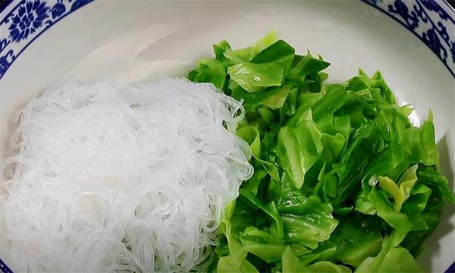 6.再把包菜下鍋,包菜煮熟之后撈出,也過下涼水,然后撈出控干水分,把包菜和粉絲都放到盆里面。