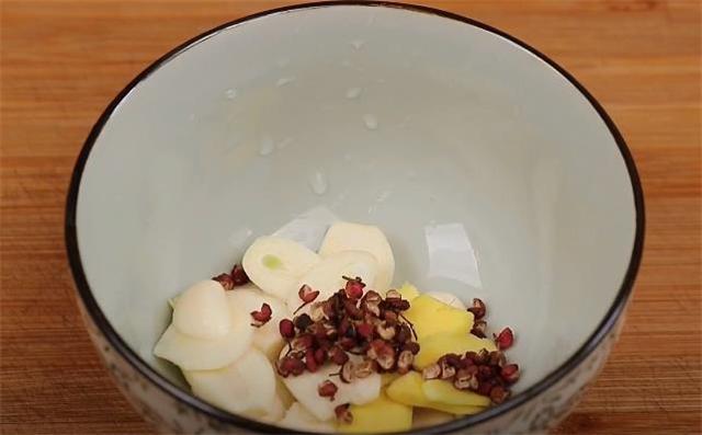 2.準備幾個大蒜切成蒜片,再準備一塊生姜切成姜片,裝入碗中備用,碗里面再放入幾粒花椒。