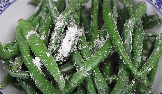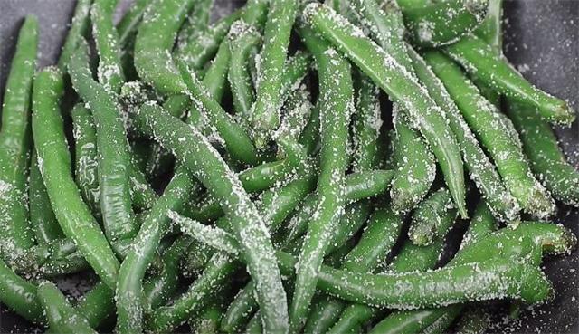 4.然后把青線椒的水分控干,青線椒煮軟后不容易折斷,雜質也不易進入,這樣就延長了青線椒的存放時間,水分控干之后我們把它放到鍋里面,往里面撒上一大把食鹽,接著下手抓拌均勻稍微多抓拌一會兒,讓青線椒上面裹上一層食鹽。