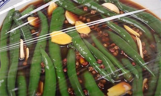 7.接下來把放涼的料汁倒入到青線椒里面,再放入蒜片姜片,我們做料汁的量一定要沒過青線椒,然后蓋上一個保鮮膜,放到陰涼的地方隨吃隨取,腌制24小時之后就可以吃了。