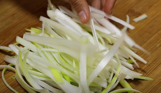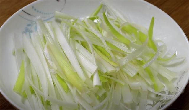 1.先準備兩根大蔥,先把大蔥切成長段,然后再把大蔥切成絲,大家注意,把大蔥切絲的時候不要切得太細,這樣吃起來口感才會更好,大概都切成這個樣子就可以了。