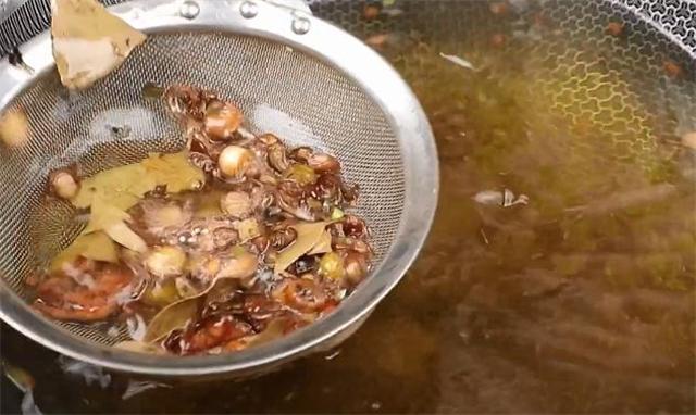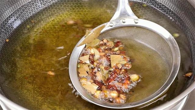 8.蔥姜微變色之后,下入剛才盤子里準(zhǔn)備的大料,現(xiàn)在油溫已經(jīng)降低,我們再開小火,把它們的香味全部炸出來,然后關(guān)火把殘渣撈出棄之。