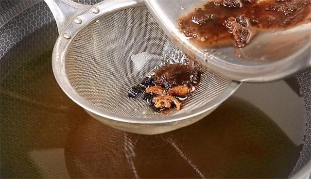 4.往鍋里放一個密一點的漏勺,把一些殘渣漏掉不要。