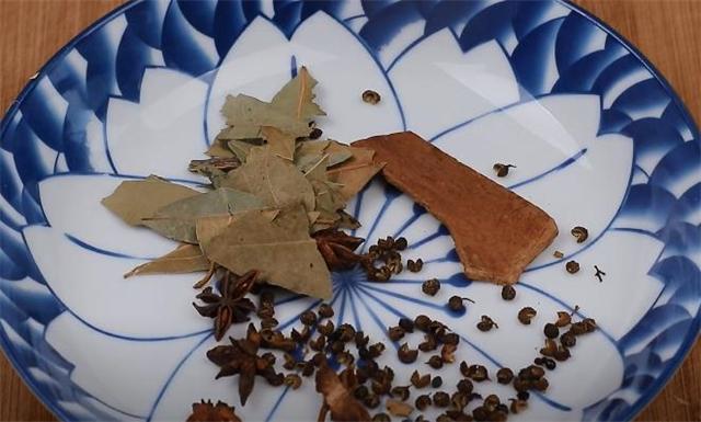 2.再準(zhǔn)備一個盤子,放入八角、花椒、桂皮和香葉。