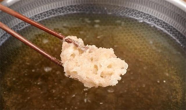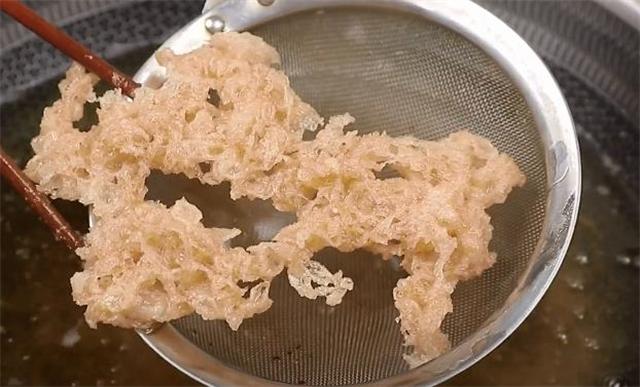 5.油溫四五成熱倒入一半的水淀粉,非常重要的一點,鍋里的油不能一次加的太多,如果太多的話就會溢鍋,那樣的話就非常危險,所以要記住少加一些油,水分蒸發(fā)之后淀粉就會被炸至定型,這樣就能吸附掉油里面的雜質(zhì),定型之后再炸十幾秒撈出,看一下,已經(jīng)吸附了很多臟東西。