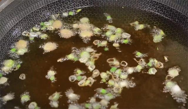 7.關(guān)火之后下入蔥姜,因為這時候油溫比較高,所以要關(guān)火下入,防止把蔥姜炸糊,油的余溫就可以把蔥姜炸香,炸成金黃色。