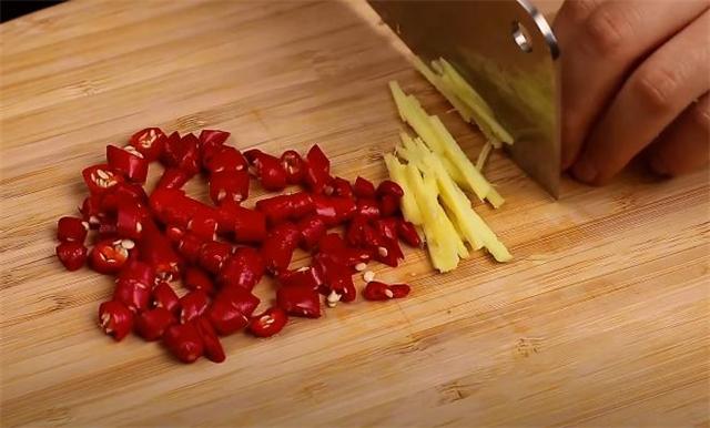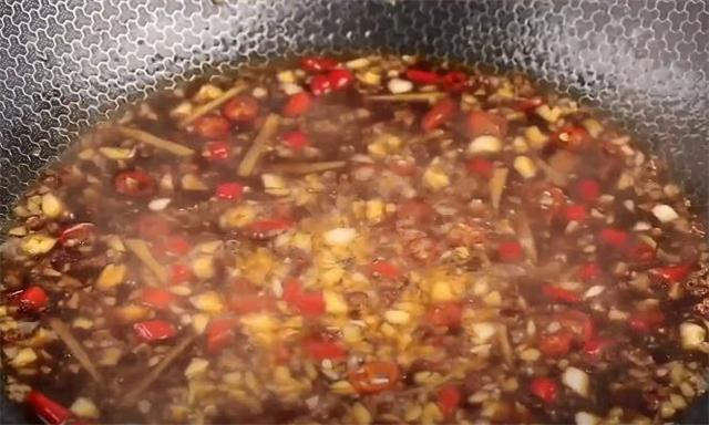 4.起鍋燒油,油熱之后下入花椒、小米辣和姜絲,再下入蒜末,炒香之后加入半碗清水,加一點老抽,再加入適量的生抽和陳醋,加點白糖,再加適量的食鹽,煮開之后給它放涼。