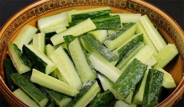 1.先把黃瓜切成小段,然后把黃瓜切成細條,切好之后裝入盆中,撒上一點食鹽,用手抓勻之后腌制2個小時,把里面的水分腌出來。