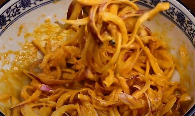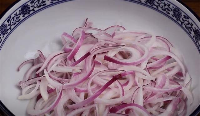 1.先把洋蔥切成細絲,用手抖散之后給它放入盆中備用。