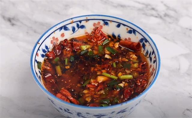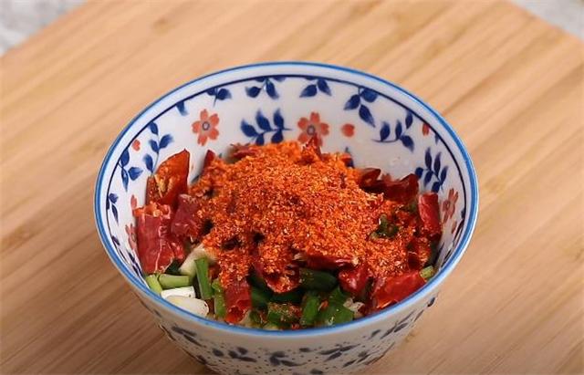4.拉好之后裝入碗中,接著加一點(diǎn)蔥花和干辣椒段,再放入一勺辣椒面。