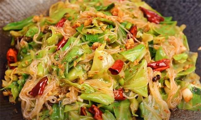 準(zhǔn)備食材: 包菜、大蒜、蔥花、干辣椒段、辣椒面、粉絲、食用油、花椒、鹽、白糖、生抽、陳醋 具體做法: