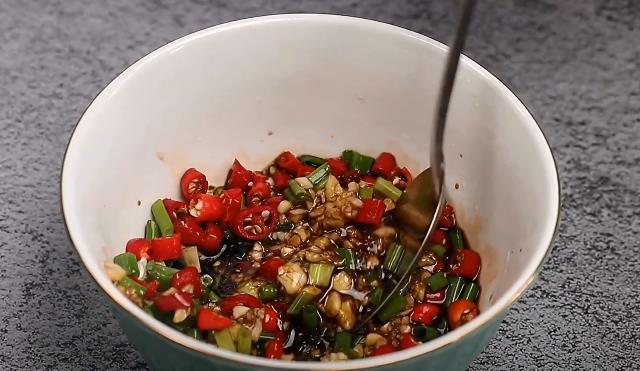 4.接著再往碗中加入蔥花和小米辣,然后加入少許的白糖和適量的食鹽,再加入一勺生抽和兩勺的陳醋,再加一勺的小磨香油,用勺子攪拌均勻。