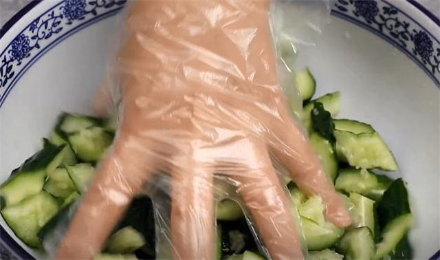 2.接著撒入兩克的食鹽,用手戴上一次性手套抓拌均勻之后腌制三分鐘,讓黃瓜入一點(diǎn)底味。