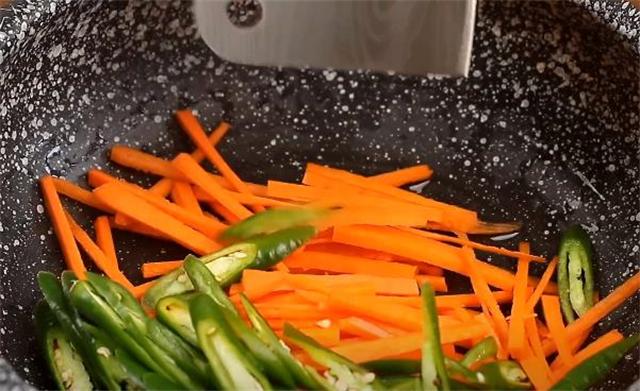 3.再準備少許的胡蘿卜切成胡蘿卜絲,接著準備三根青線椒給它切一下。