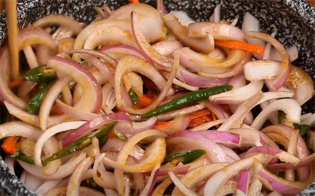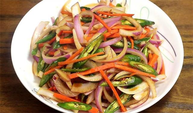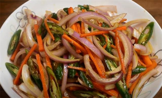 準備食材: 洋蔥、胡蘿卜、青線椒、大蒜、生抽、陳醋、鹽、白糖、白胡椒粉、小磨香油 具體做法: