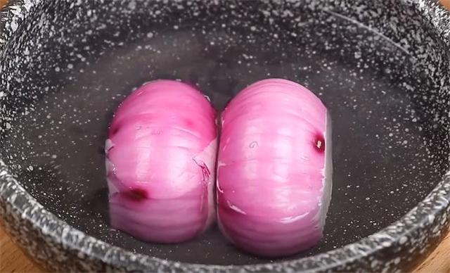 1.先把洋蔥對半切開,放涼水里面浸泡五分鐘,防止切的時候辣眼睛。