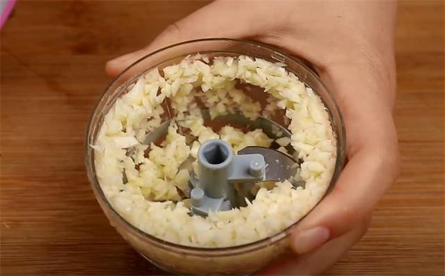 5.拉蒜器里放入大蒜,這個拉蒜器特別好用,幾秒就拉成蒜末了。