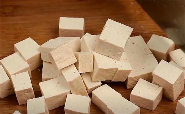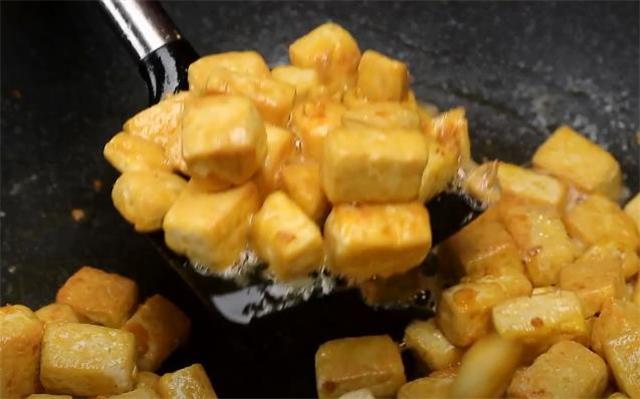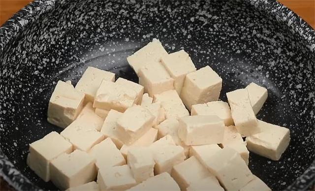 4.起鍋燒油把豆腐下鍋煎,煎成這樣八面金黃就可以了。