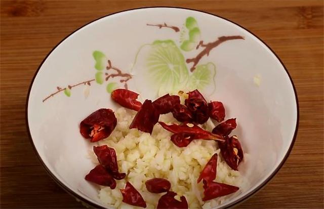 2.往拉蒜器里放入大蒜,5秒鐘給它拉成蒜末,放入碗中,再放點干辣椒段。