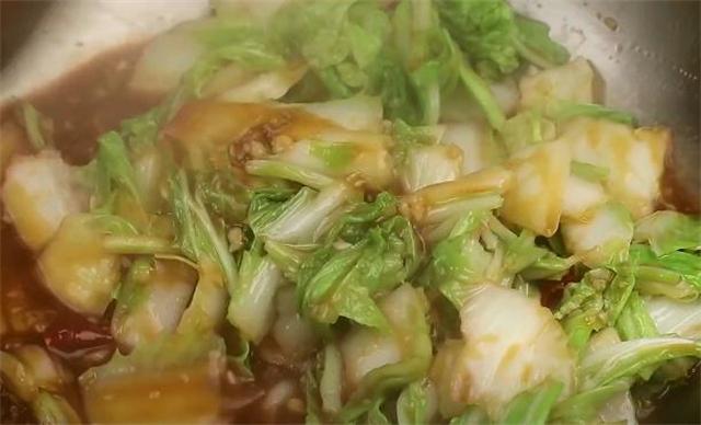4.起鍋燒油下入蒜末和干辣椒段爆香,炒香后下入白菜,大火翻炒,炒2分鐘左右,炒軟后倒入料汁,繼續翻炒一分鐘左右入味,翻炒均勻后裝盤即可。