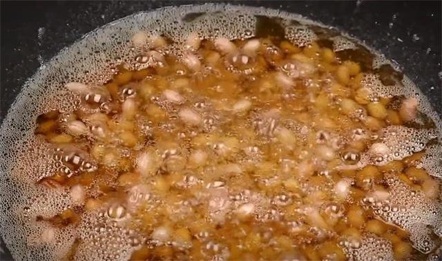 4.第三階段就能聽到花生米噼里啪啦的炸響聲,這個階段花生米受熱膨脹就會變脆,大概需要一分鐘30秒左右的時間,當花生米炸響聲漸漸的變小后撈出控油。